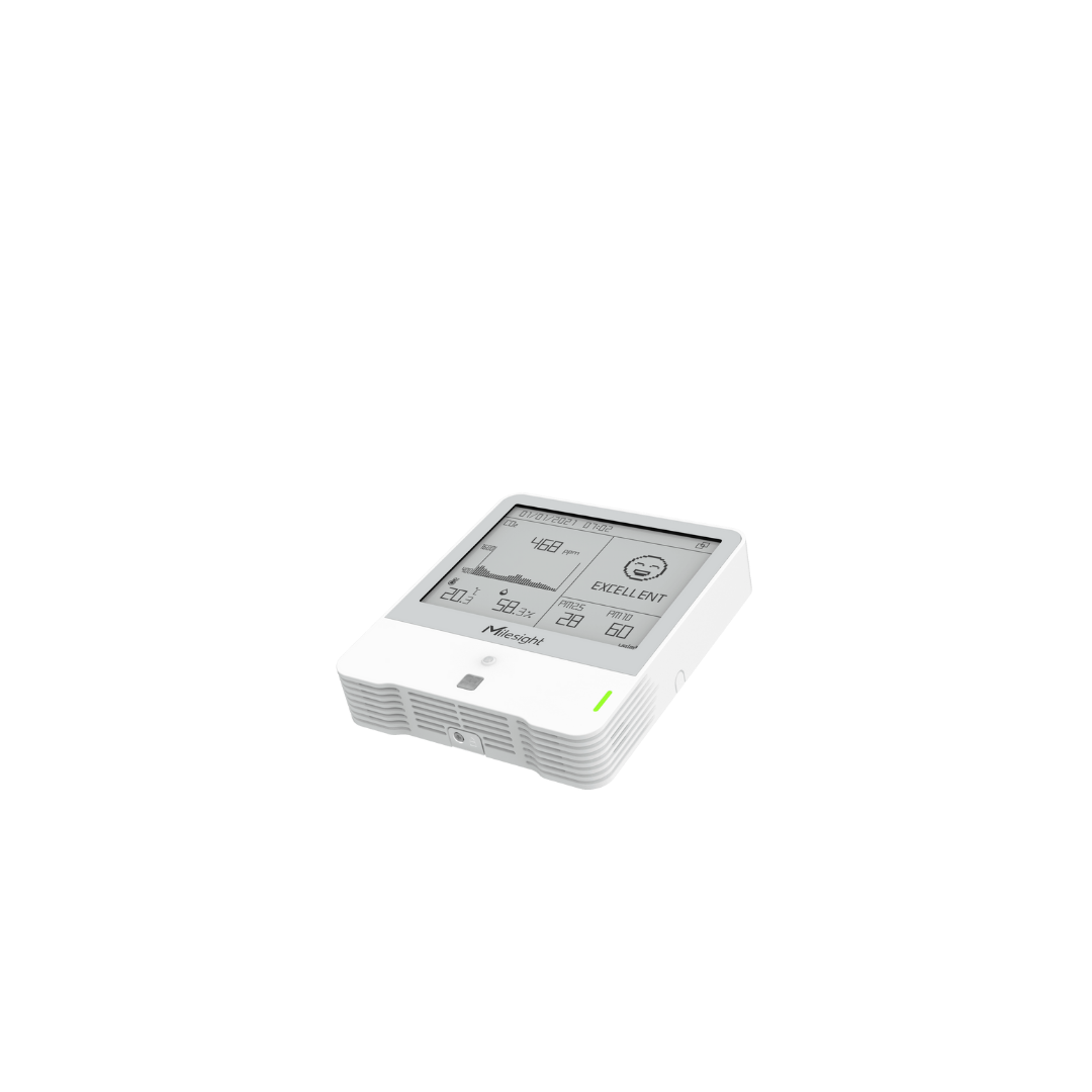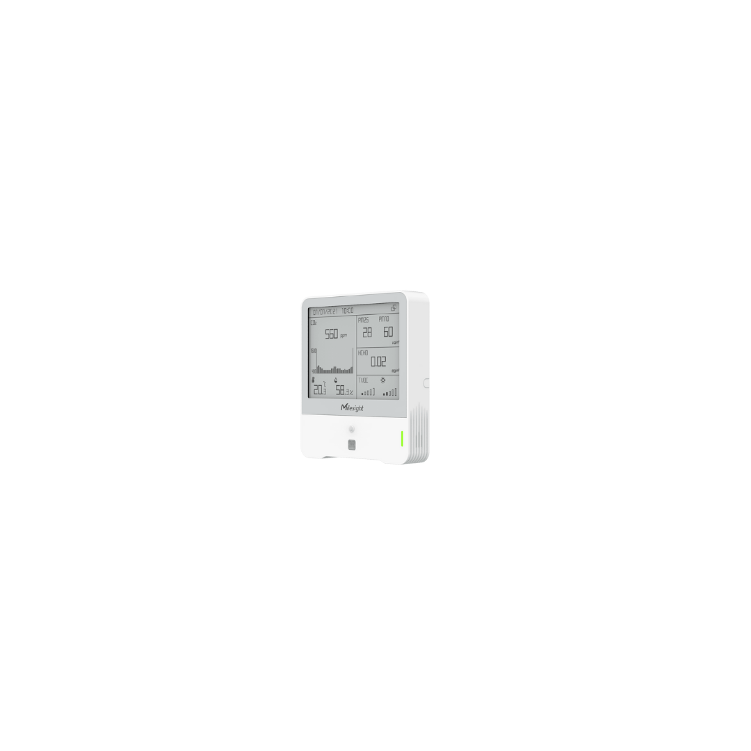 The Milesight AM319 HCHO is an advanced LoRaWAN® indoor environmental monitoring sensor that measures CO₂, particulate matter (PM), and formaldehyde (HCHO) concentrations, delivering comprehensive insights into indoor air quality. Measurement data is displayed in real time on the 4.2-inch E-ink display, offering excellent readability with low power consumption.